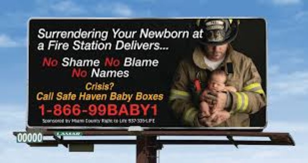 The billboard reads, “No Shame, No Blame, No Names,” reminding parents they can safely and anonymously surrender their baby.
