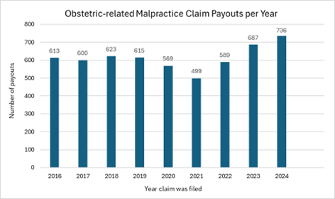 Because 2025 is not yet over, I have not included 2025 numbers in anything below. I went back to 2016 to cover both pre- and post-Dobbs and different sitting presidents. When I say “payout(s)” I am referring specifically to payouts for obstetric-related medical malpractice lawsuits.