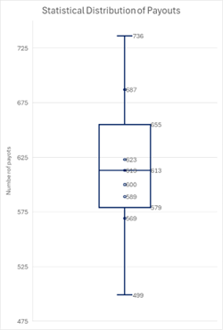 Figure 2: Quartile analysis of payouts since 2016 using a box and whisker chart. Data points above and below the boxes (part of the “whiskers”) are statistical outliers to the data group.