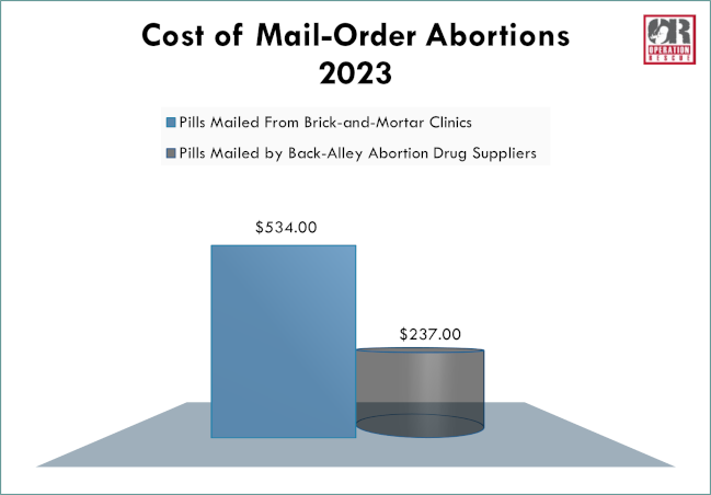 The average cost of chemical abortion drugs mailed by these unscrupulous businesses is $237, less than half the average price charged by abortion clinics increasingly following suit in this dangerous practice. The dramatic difference in price is explained by the extremely low overhead involved when no building, medical equipment, or oversight by a clinician are made available.