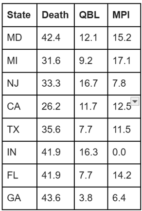 Table 2: The number of payouts for varying levels of severity of the claim by state. QBL means quadriplegic, brain dead, or lifelong care. MPI means major permanent injury.