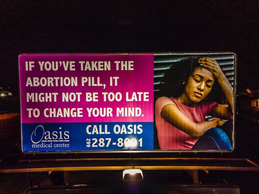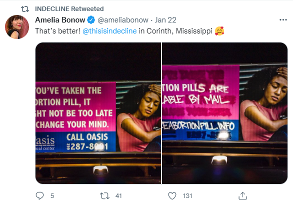 “Abortion pills are available by mail,” the vandals wrote across the billboard; they also painted a website address for abortion pills that takes visitors to the Shout Your Abortion website.