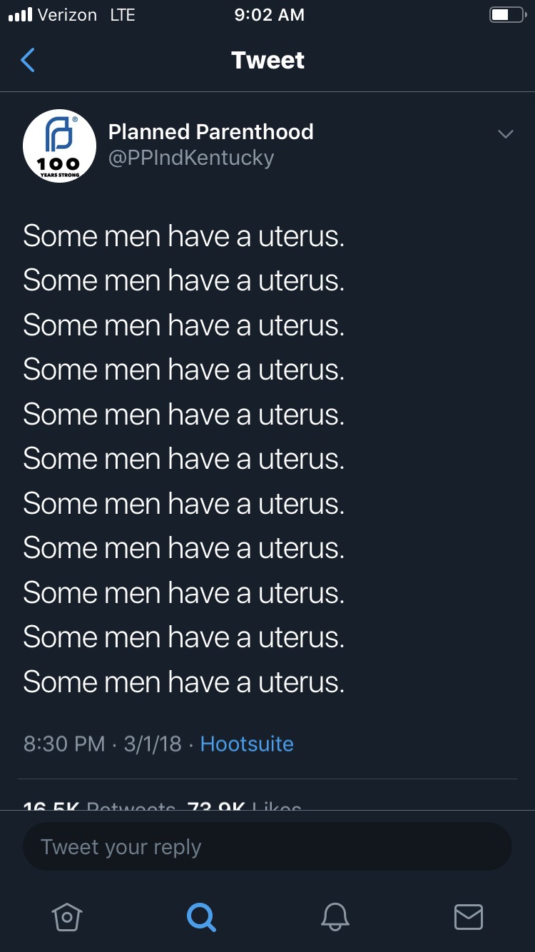 For a movement that has obscured science and reason in favor of a “might makes right” pseudo-philosophy, Ginsburg’s dig isn’t all that surprising. Indeed, the respondent in this very case—Planned Parenthood of Indiana and Kentucky—has pinned to the top of its Twitter feed a 2018 Tweet that intones, “Some men have a uterus” eleven times over.