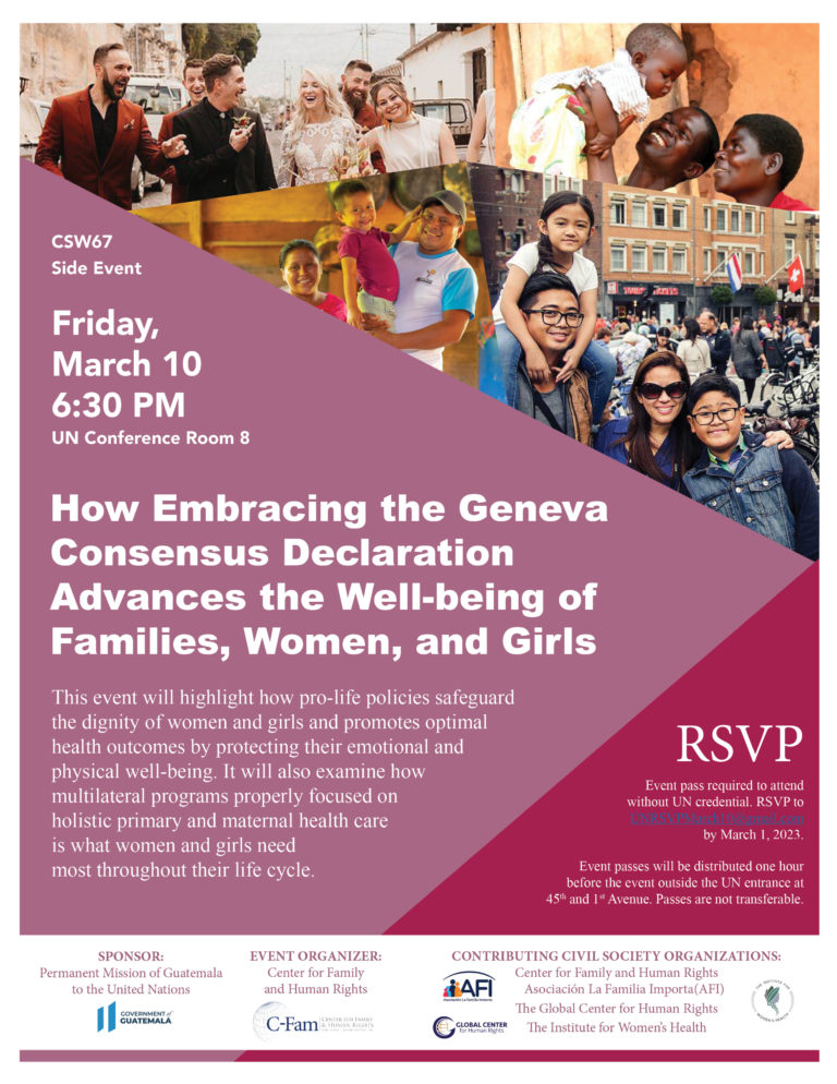 Titled, “How Embracing the Geneva Consensus Declaration Advances the Well-being of Families, Women, and Girls,” the event will examine how programs focused on holistic primary and maternal healthcare meet women’s needs. The event is also set to highlight how “pro-life policies safeguard the dignity of women and girls and promotes optimal health outcomes by protecting their emotional and physical well-being.”