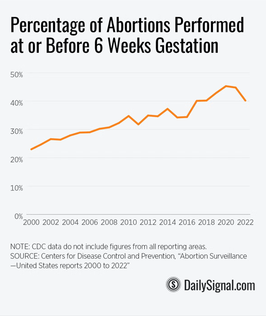 Another troubling dynamic is the shift in when abortions occurred, particularly abortions prior to six weeks gestation (the point at which ultrasound typically can detect an unborn child’s beating heart). In recent years, the percentage of abortions at or before six weeks was rising higher and higher, meaning women were obtaining abortions earlier and earlier in pregnancy.
