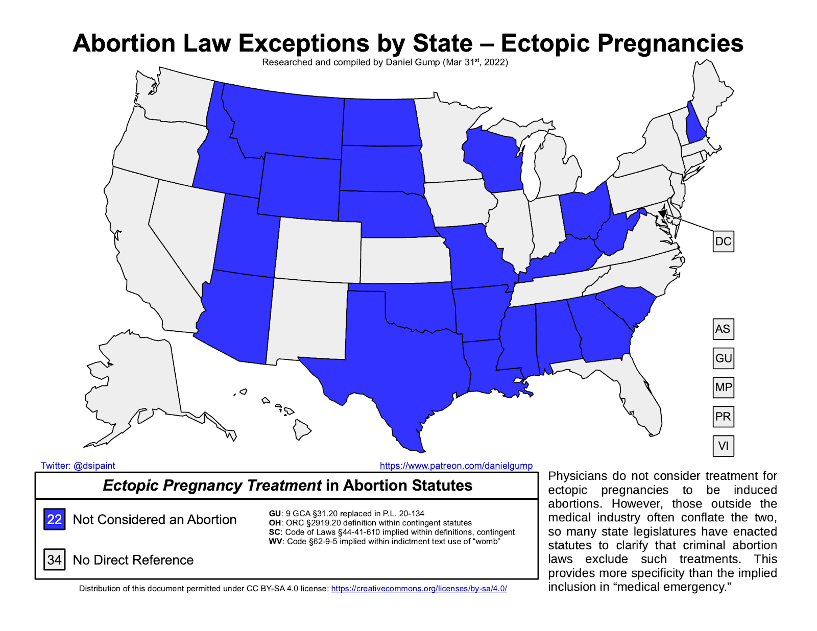 In 22 states/territories there are direct mentions in pro-life laws that exempt ectopic pregnancies from the laws and 34 do not make specific references to ectopic pregnancies.