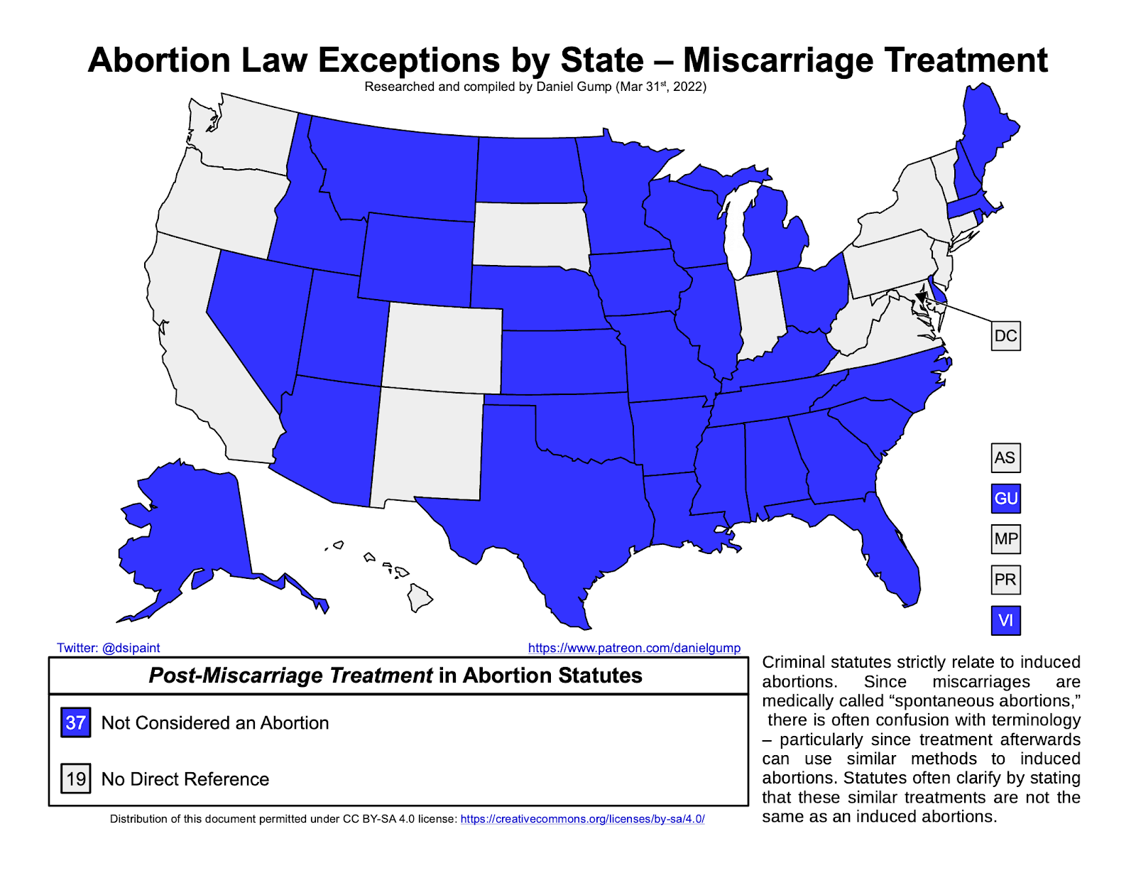 In 37 states/territories there are direct mentions in pro-life laws that exempt treatment for miscarriages from the laws and 19 without specific references.