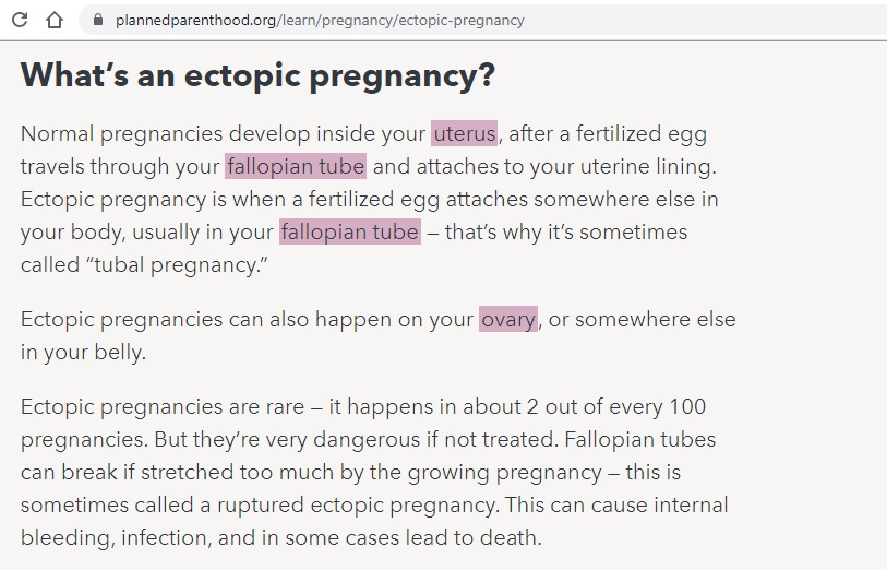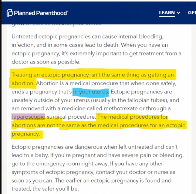 Even Planned Parenthood’s website clearly defines ectopic pregnancy as something that is not corrected with an abortion procedure. It states: