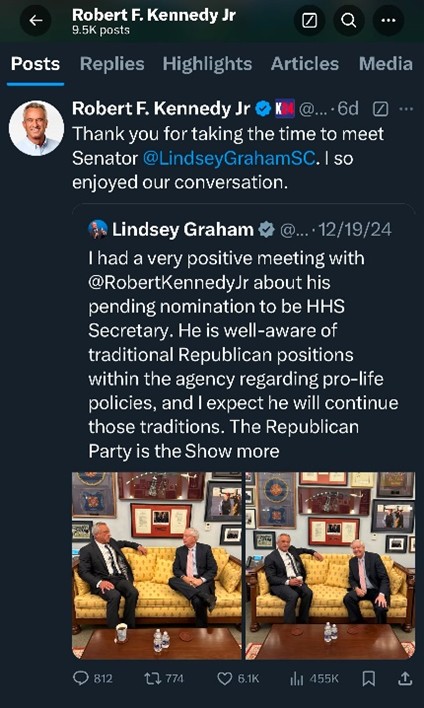 S.C. Senator Lindsey Graham posts about his meeting with Kennedy and the expectation to continue pro-life traditions of the Republican party.