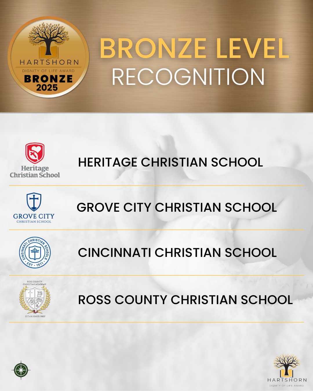 Bronze level recipients for 2025 include Heritage Christian School of Canton, Grove City Christian School, Cincinnati Christian School, and Ross County Christian Academy of Chillicothe.