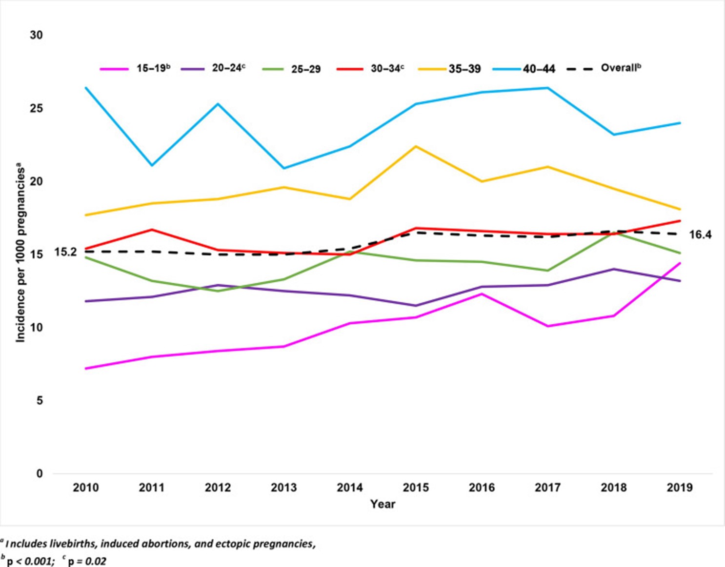 - 2010–2019: The annual incidence increased from 15.2 to 16.4 per 1,000 pregnancies
