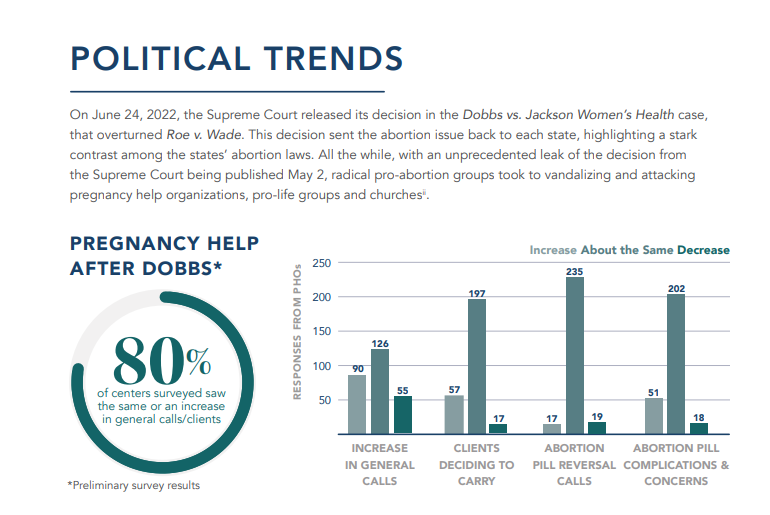 Another important stat: 80% of centers surveyed saw the same level or an increase in general calls and clients after the Supreme Court overturned Roe v. Wade on June 24, 2022. It’s also known as the “Dobbs decision,” which denotes the case that ultimately led to the fate of Roe.
