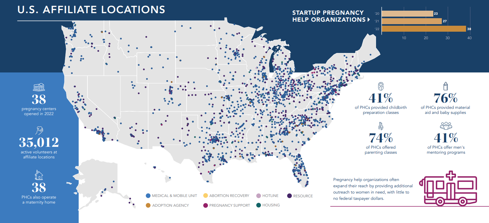 In one example, in 2022 there were 2,836,300 total in-person client visits at pregnancy help organizations in the U.S., an increase of 36% over 2021.