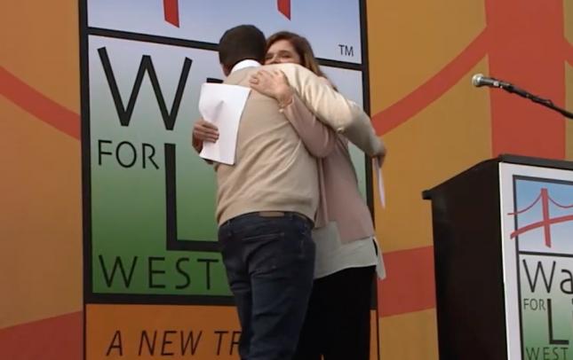 To the delight of the crowd, when Folan completed her remarks, her son Nathan walked out from the wings and joined her on stage.