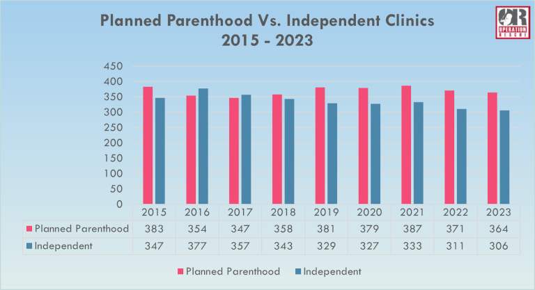Surprisingly, this uptick in chemical abortions is not currently driven by Planned Parenthood but by independent clinics. In the last year, independent pill-only clinics have increased from 65 to 88, a huge 26% jump. Accordingly, the number of independent surgical abortion clinics fell from 247 to 218 – a significant 12% decrease.