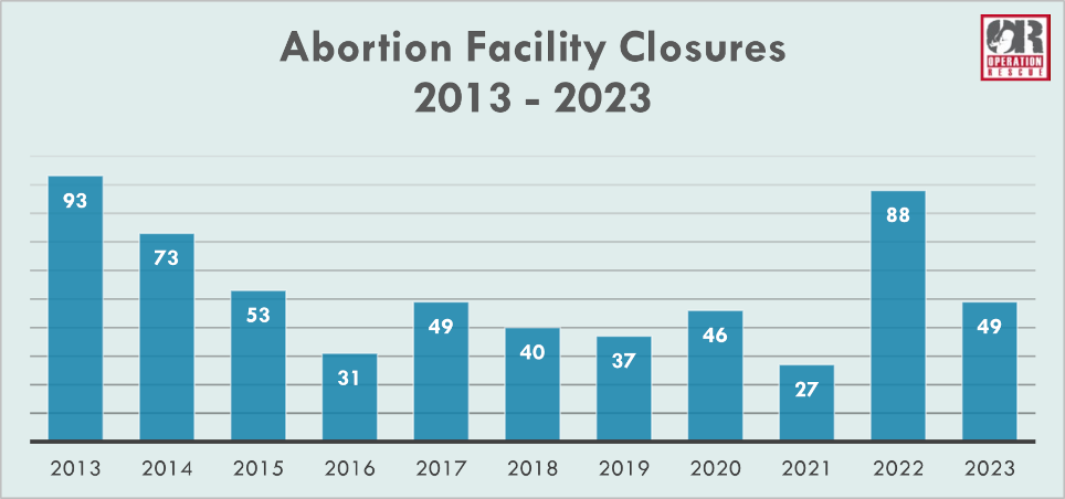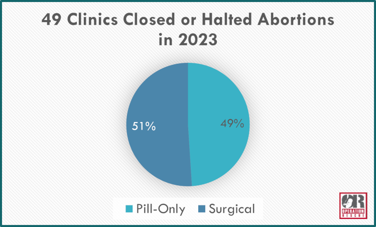 (Operation Rescue) Operation Rescue’s 2022 annual survey revealed a colossal 88 abortion clinic closures. In 2023, another 49 abortion clinics closed or halted abortions, for a total of 137 clinic closures in the last two years.