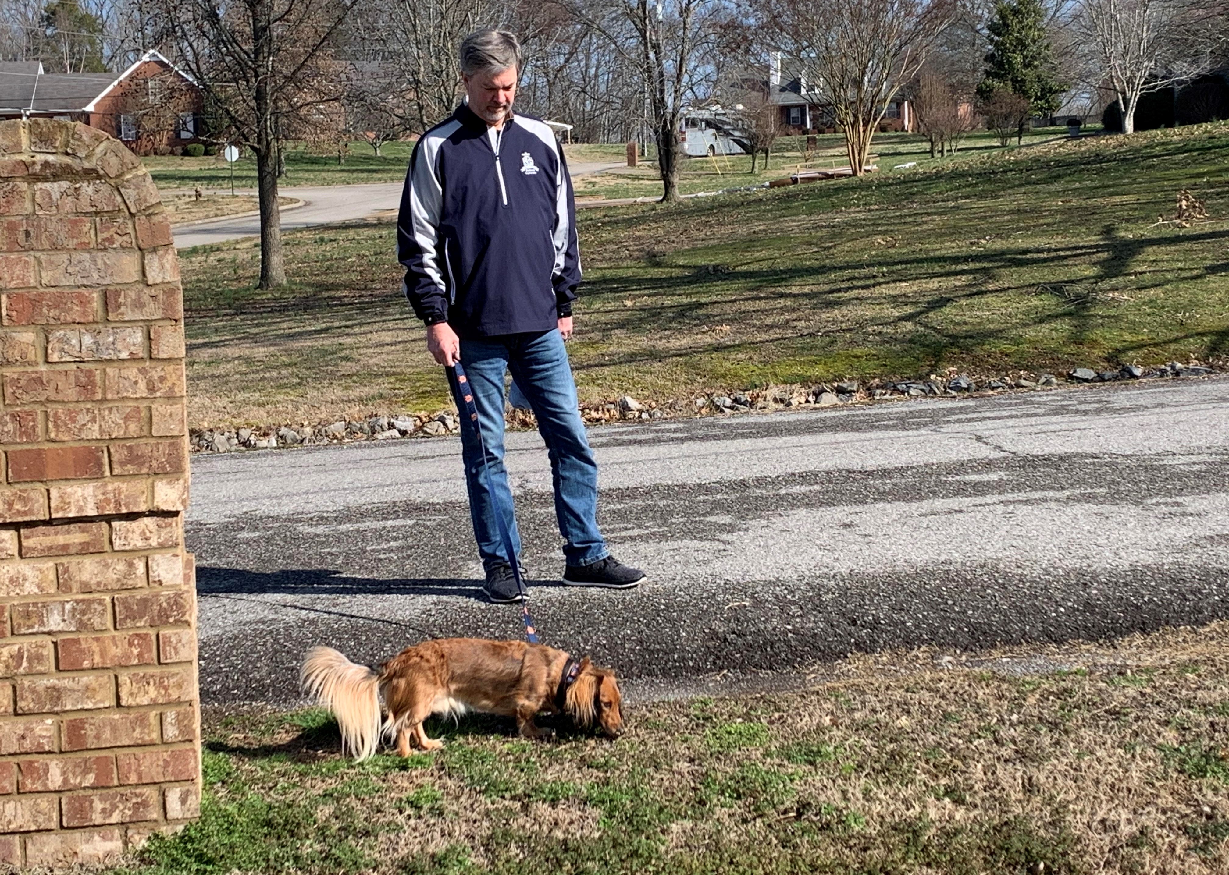 At some point, I finally stop walking. Because Aubie is on a leash, he takes a few more steps before facing the stark, brutal reality that we’re at the end of the road. If he’s going to get the job done, he knows to stop dawdling and make it happen.