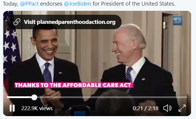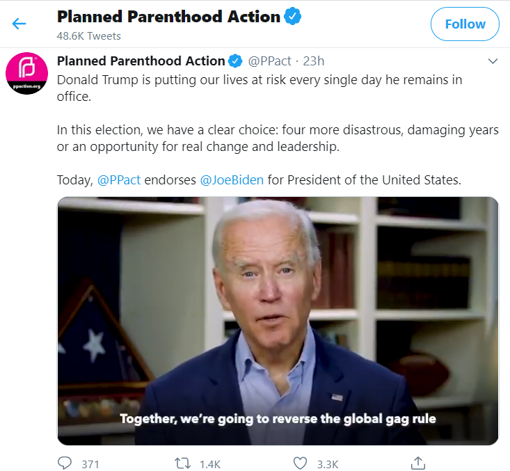 Tweet This: Planned Parenthood's endorsement of Joe Biden comes as “no surprise”