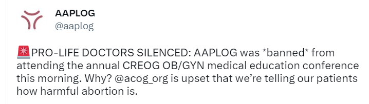 ?PRO-LIFE DOCTORS SILENCED: AAPLOG was *banned* from attending the annual CREOG OB/GYN medical education conference this morning. Why? @acog_org is upset that we’re telling our patients how harmful abortion is. pic.twitter.com/gaImTwfEsm