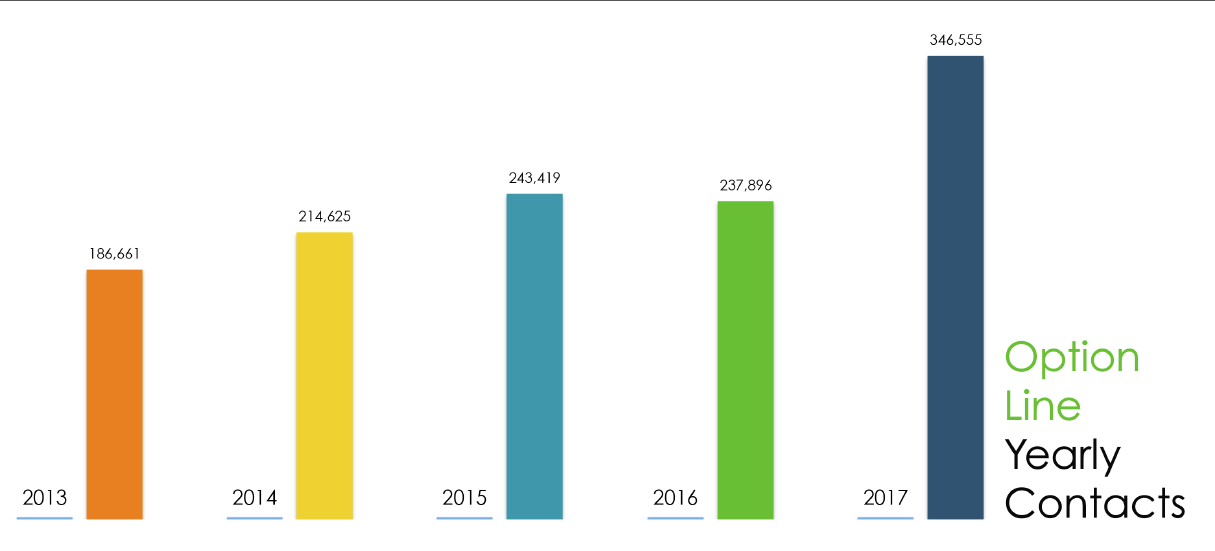 Since launching in 2003, Option Line’s contact volume has been on a steady climb—including calls, texts, live chats and emails. Expected to reach close to 350,000 individuals by the end of this year, Option Line’s 2017 total represents a 32 percent increase from its 2016 contact volume.