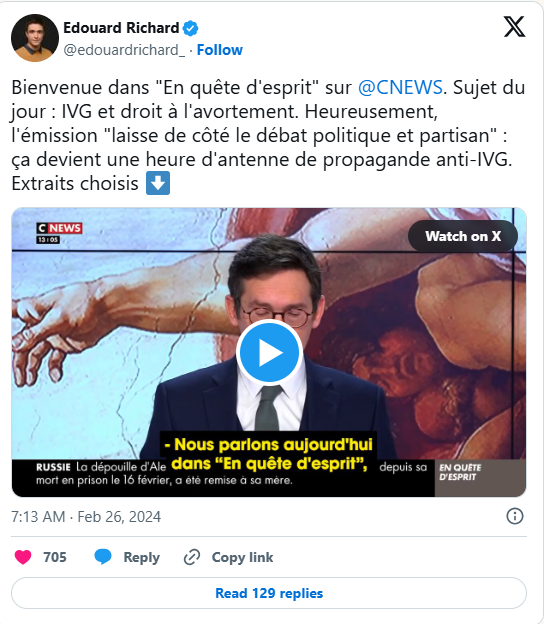 The fine was imposed by the French media regulatory body Arcom after a CNews journalist made a reprehensible assertion on in February 2024 on its program "En quête d'esprit" (“In Search of Spirit”). In a discussion amongst several women about the psychological consequences of abortion, presenter Aymeric Pourbaix said that abortion was killing babies. All hell broke loose amongst the bien-pensants of the Twitterverse.