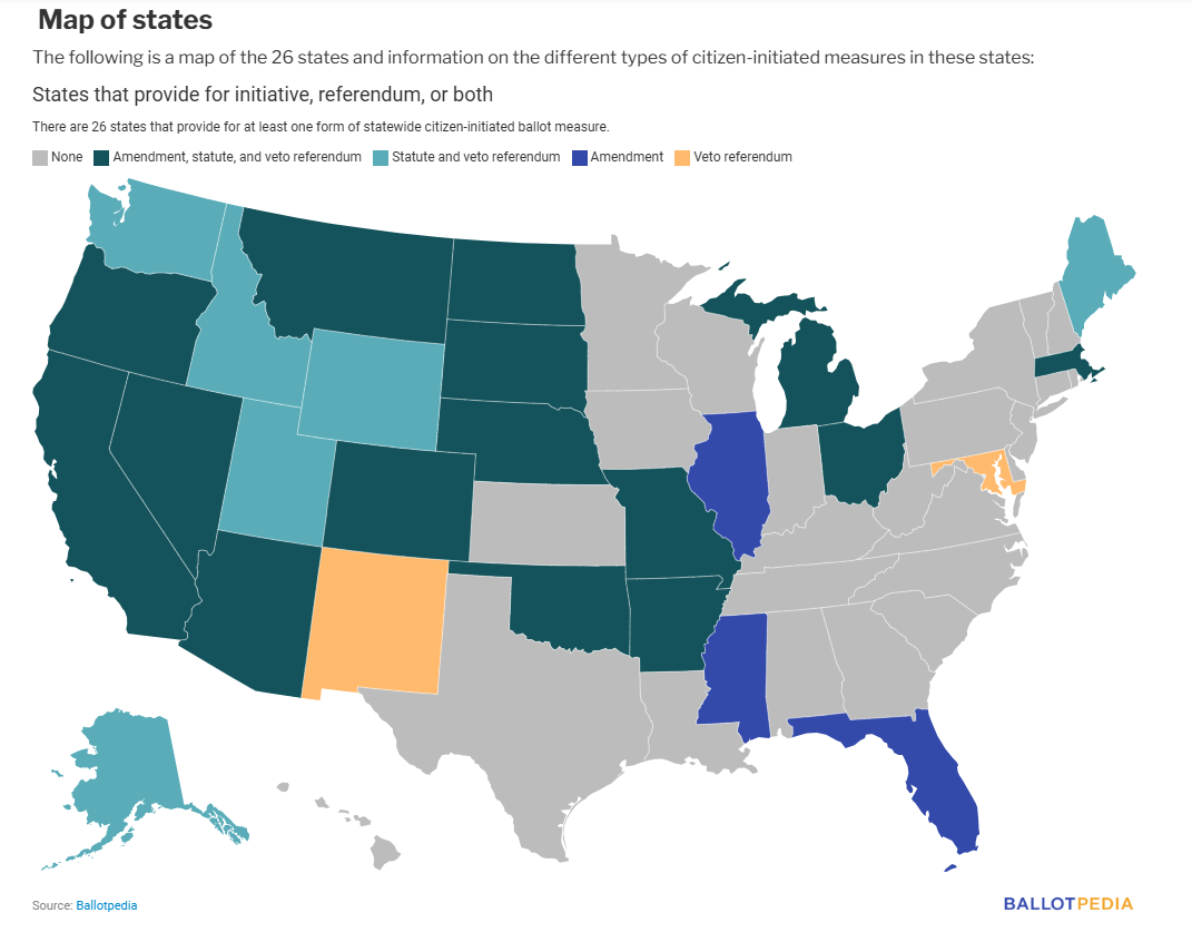 Currently, 26 states allow some form of direct democracy – where citizens themselves vote upon proposed laws. Many of those states only require a majority of voters to approve constitutional amendments – a very easy threshold to reach, and allowing for outside, big money groups to influence results.