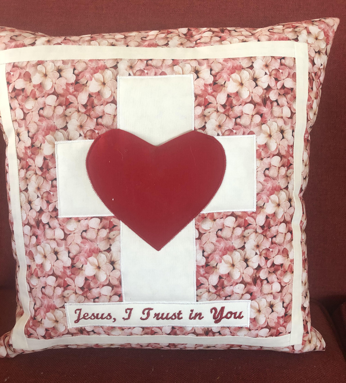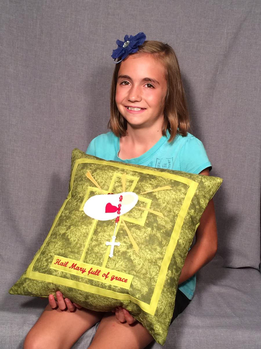 They talked about how they could help moms and babies, and Grace said she wanted to make something. They decided on prayer pillows with a cross stitched on the fabric plus a pocket with either a rosary or a prayer card tucked inside.