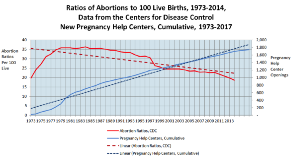 While abortion ratios have gone down (the red line below), the number of new pregnancy help centers has increased (the blue line). (Heartbeat International kindly provided the statistics on new pregnancy centers.)