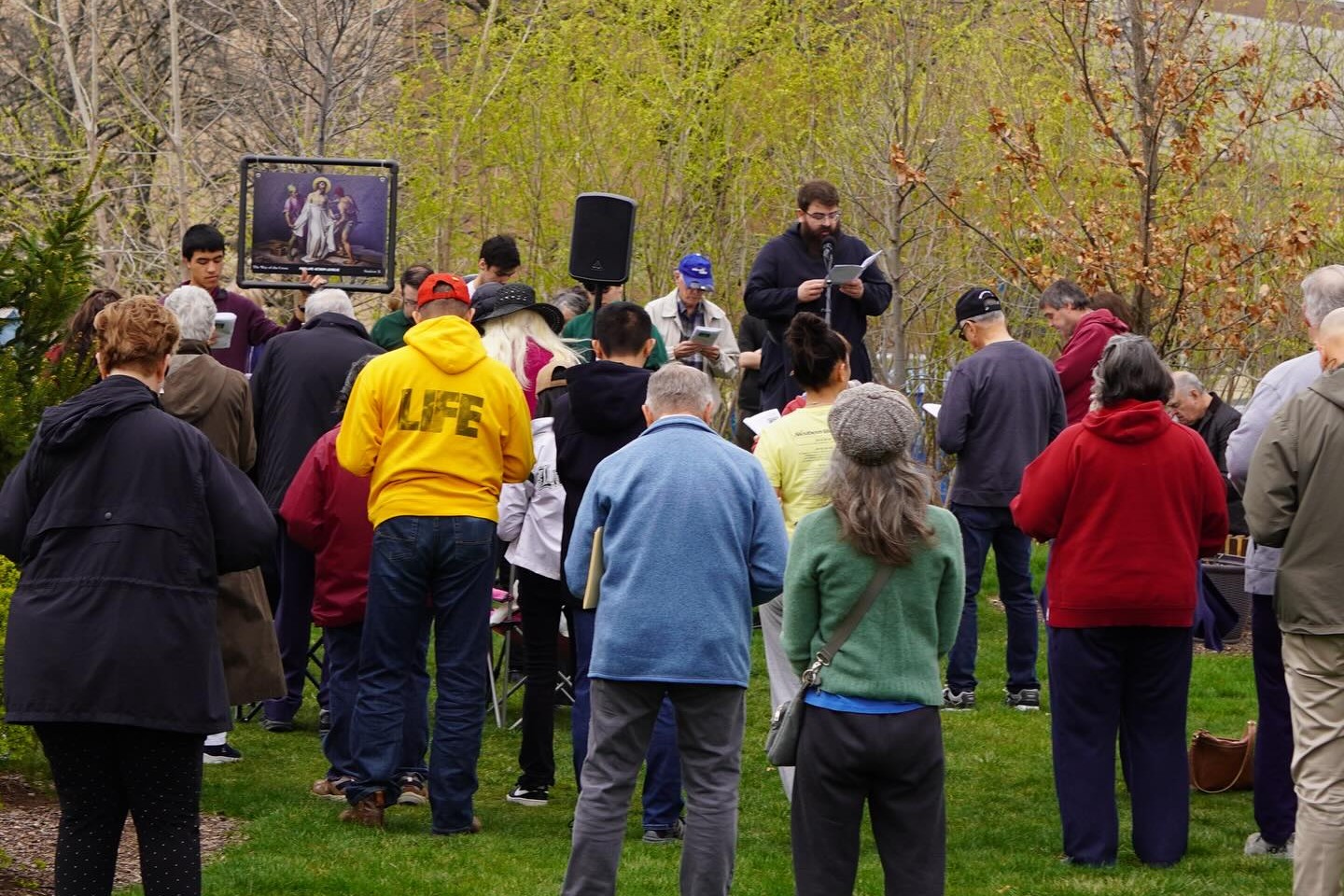 The group reflected on Christ’s Passion while they prayed before a series of images depicting the Stations of the Cross that was fastened to a barbed-wire fence along the edge of a parking lot across from the abortion facility. The final station was followed by a Divine Mercy image.